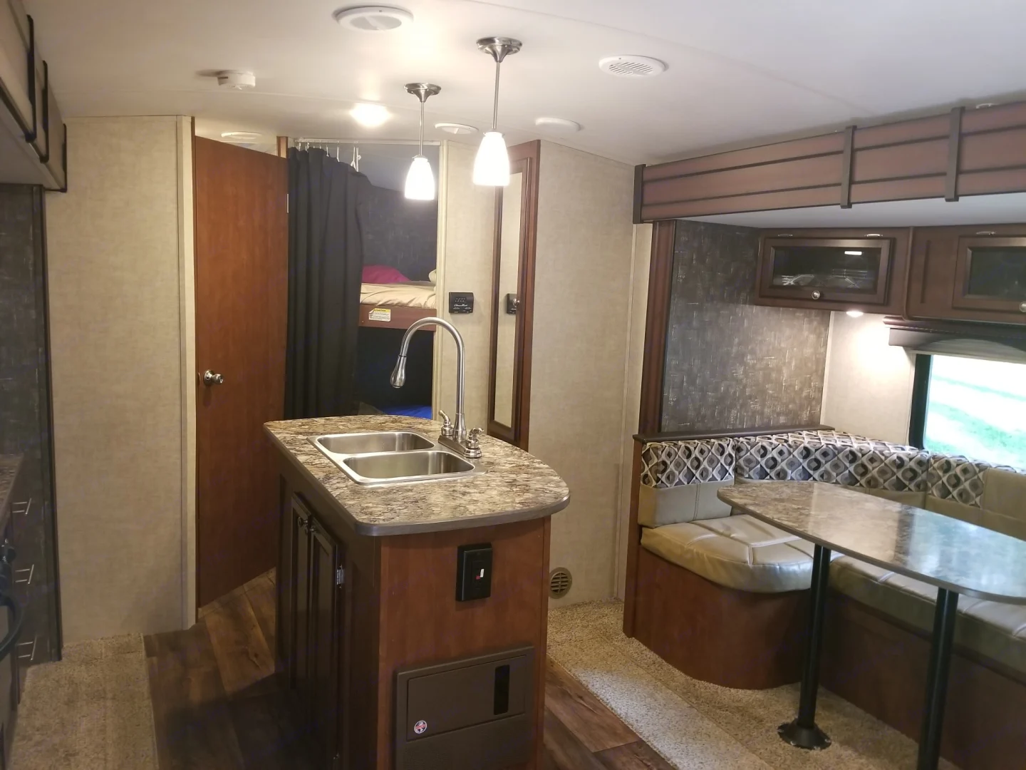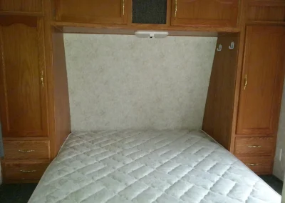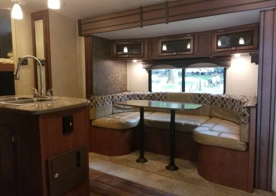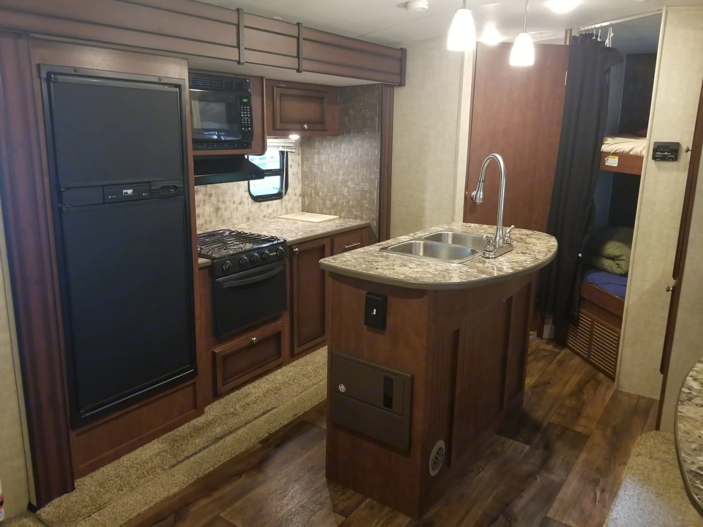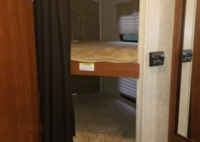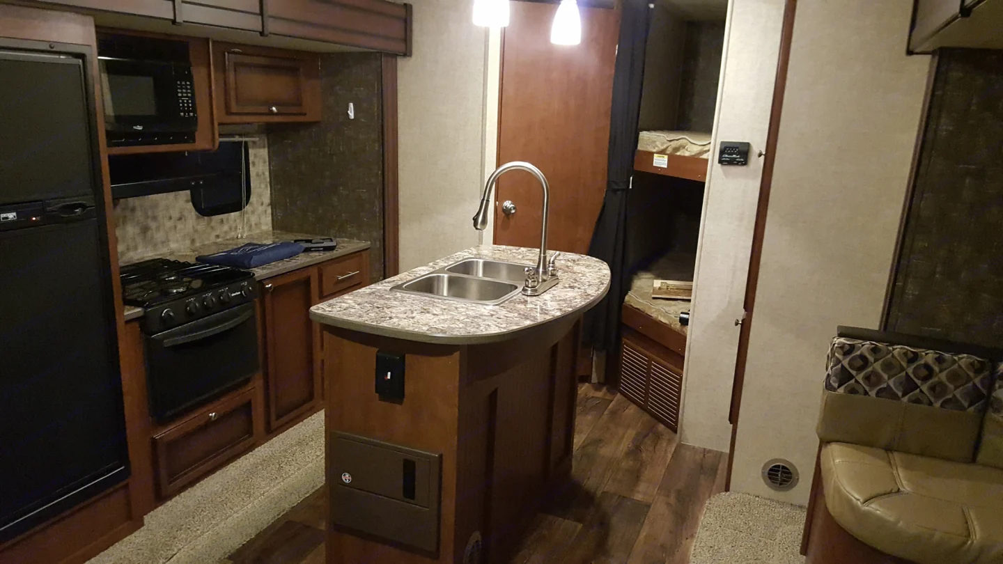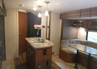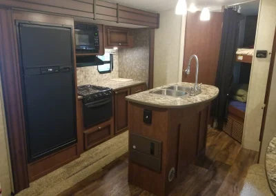 You can easily relax and spread out in our Heartland Wilderness 2375BH, a 24-foot camper with two slide-outs and an open layout that gives you and your family plenty of space. This model features an island kitchen, a private queen bedroom in the front, and oversized double bunk beds in the rear for the kids or extra guests. As you enter through the main door, you’ll notice the bright and open layout. To the right is the private front bedroom with a queen bed, overhead storage, and wardrobes on each side. In the main living area, one slide-out opens up the large u-shaped dinette and fridge area, while the other slide holds the full kitchen and pantry. The center island includes a deep sink and added counter space for cooking and cleanup. The kitchen is stocked with a 4-burner range, oven, microwave, and refrigerator. The rear of the camper has double-over-double bunks and a full bathroom with a shower, toilet, and sink with vanity.