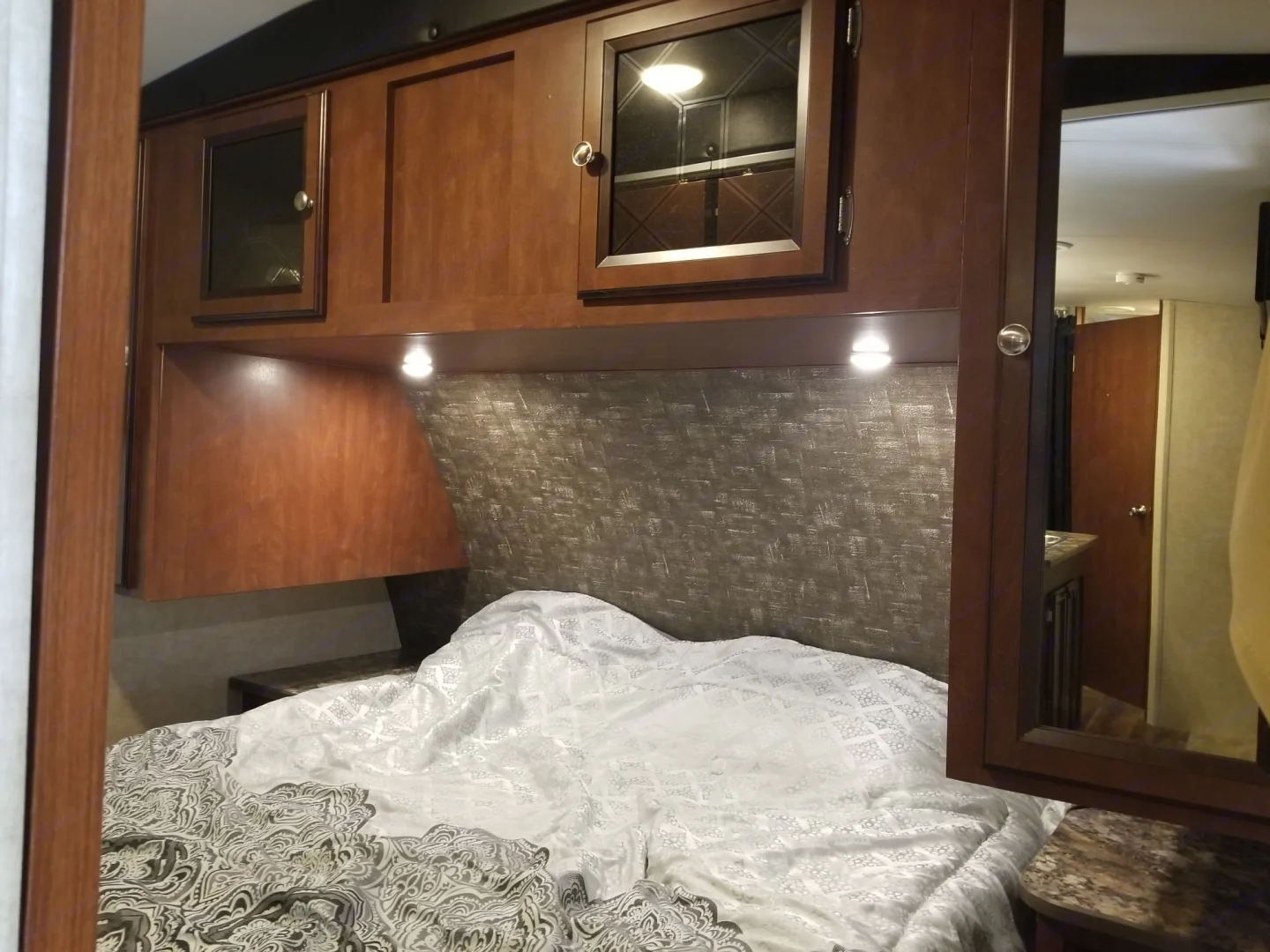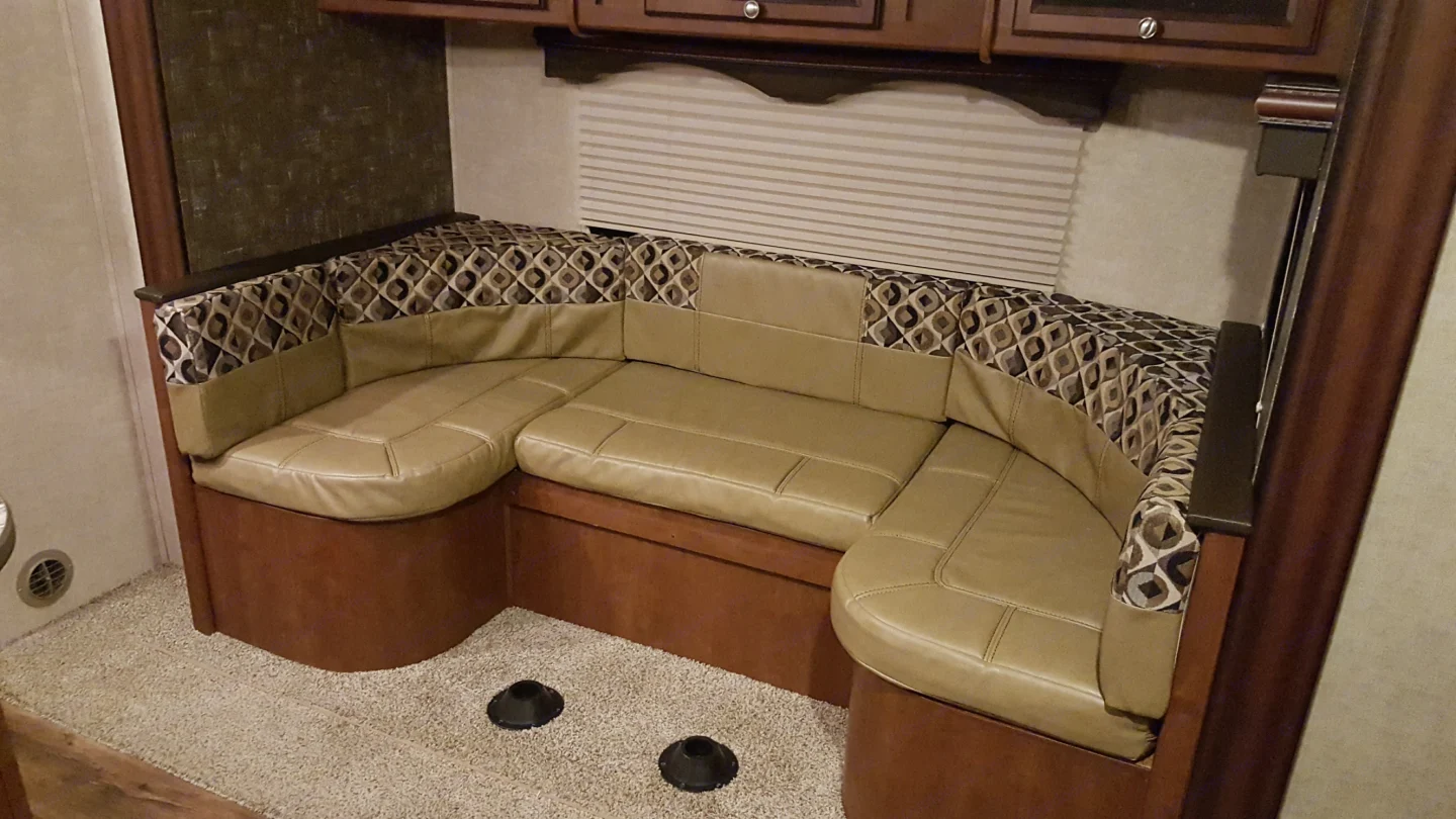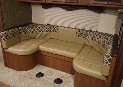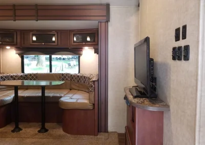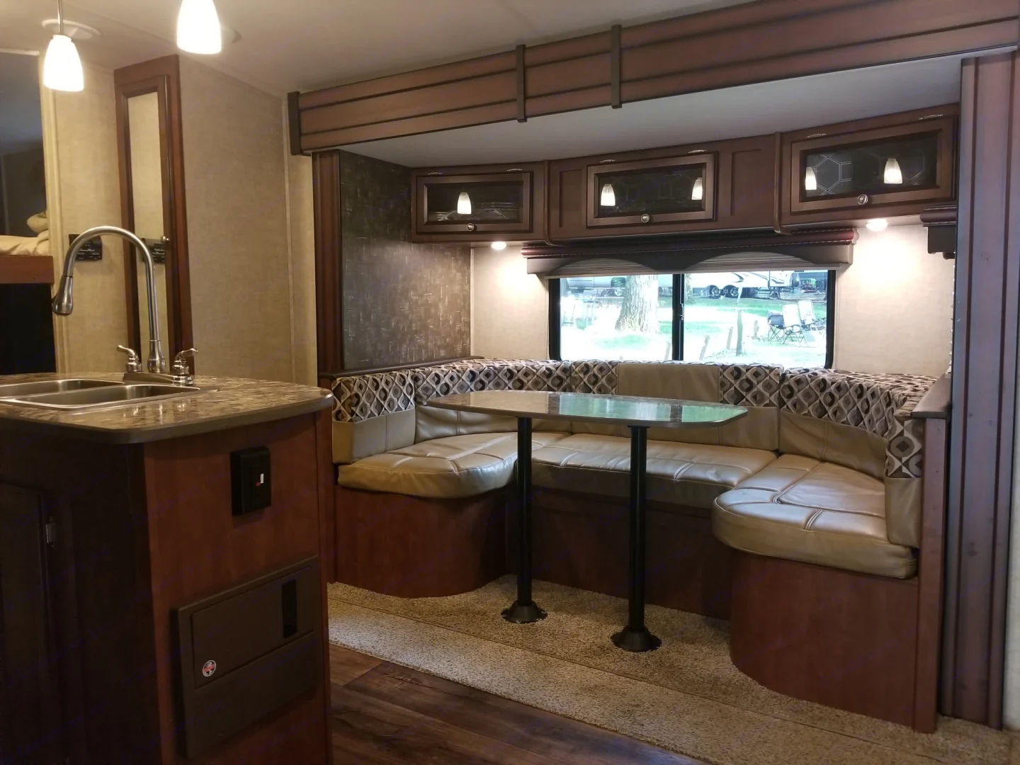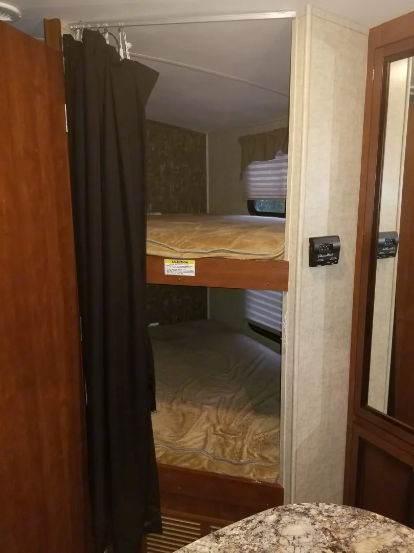 You can easily relax and spread out in our Heartland Wilderness 2375BH, a 24-foot camper with two slide-outs and an open layout that gives you and your family plenty of space. This model features an island kitchen, a private queen bedroom in the front, and oversized double bunk beds in the rear for the kids or extra guests. As you enter through the main door, you’ll notice the bright and open layout. To the right is the private front bedroom with a queen bed, overhead storage, and wardrobes on each side. In the main living area, one slide-out opens up the large u-shaped dinette and fridge area, while the other slide holds the full kitchen and pantry. The center island includes a deep sink and added counter space for cooking and cleanup. The kitchen is stocked with a 4-burner range, oven, microwave, and refrigerator. The rear of the camper has double-over-double bunks and a full bathroom with a shower, toilet, and sink with vanity.